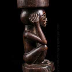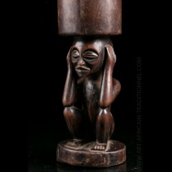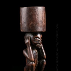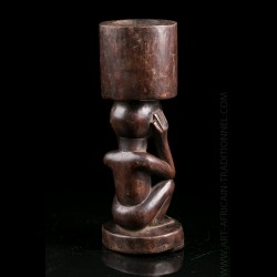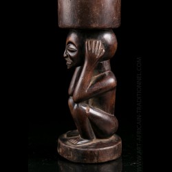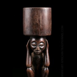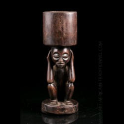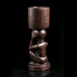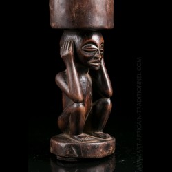 Piece from a Brussels collection of which other objects are offered in this exclusive sale. These objects were brought back by an employee of a mining company in the Congo. Snuffbox or tobacco bottle of dignitary presenting on the lower part a squatting figure. His head is surmounted by a receptacle. Old shiny brown patina.