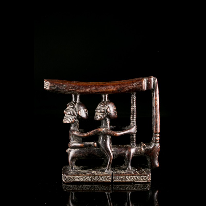 L'exemplaire que je vous propose ici se compose d'une assise soutenue par deux personnages se trouvant sur le dos de leur monture dont les cornes rejoignent l'assise. Un exemplaire similaire se trouve dans l'ouvrage Luba : aux sources du Zaïre, F. NEYT, p. 186, voir photo.
