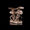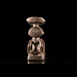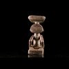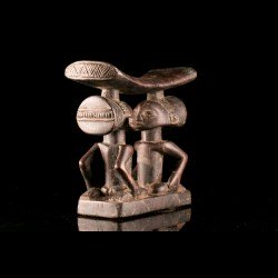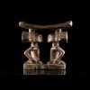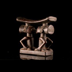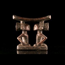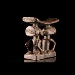 Cet objet traditionnel monoxyle est sculpté sous la forme d'un appuie-nuque soutenu par deux personnages cariatidiques se faisant face.