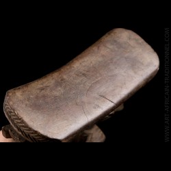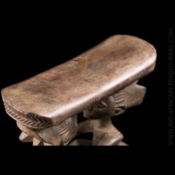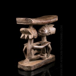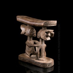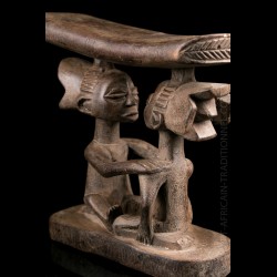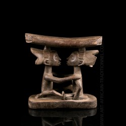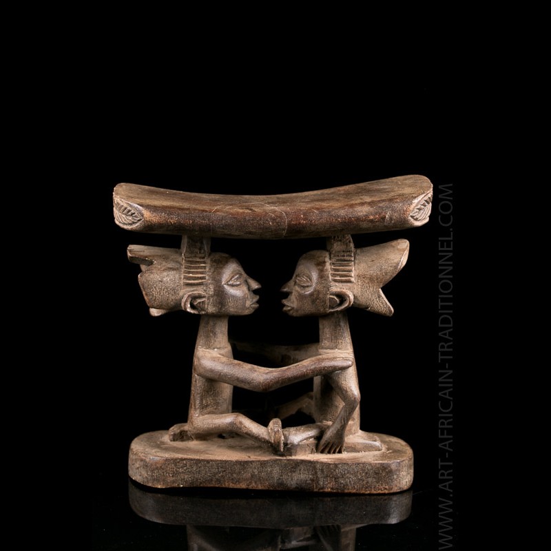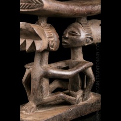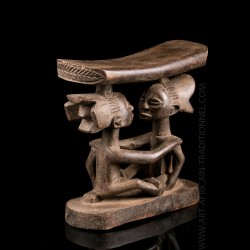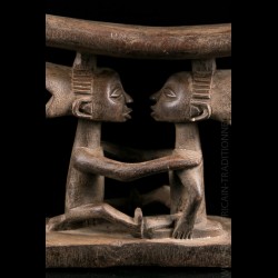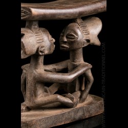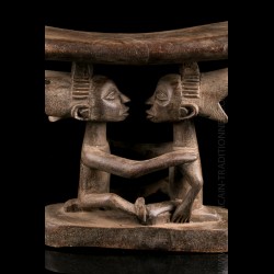 Cet appuie-nuque est constitué d'une base sur laquelle se tient côte à côte un couple, chacun ayant un bras placé dans le dos de l'autre. Les personnages soutiennent sur leur tête l'assise de la pièce.