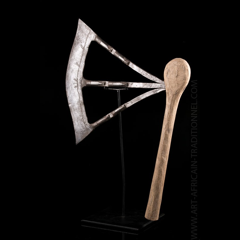 Belle hache Songye type "Nsapo" comportant un manche en bois. Le fer de la hache se divise en trois branches. Ce dernier porte une série de petits poinçons appliqués par le forgeron. La branche supérieure est joliment torsadée tandis que les deux autres sont ornées de visages. Il s'agit d'éléments récurrents sur les armes Songye.