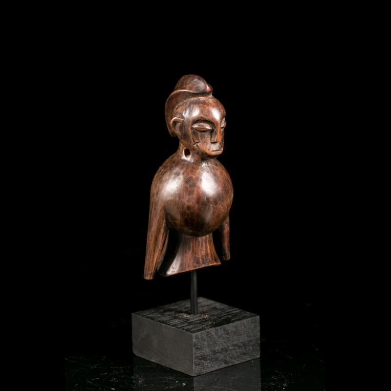Le son pouvait être modulé grâce à l'extension latérale du sifflet. L'ajout de visages ou d'éléments figuratifs, comme celui présent sur cet objet, confère un prestige supplémentaire à son propriétaire.