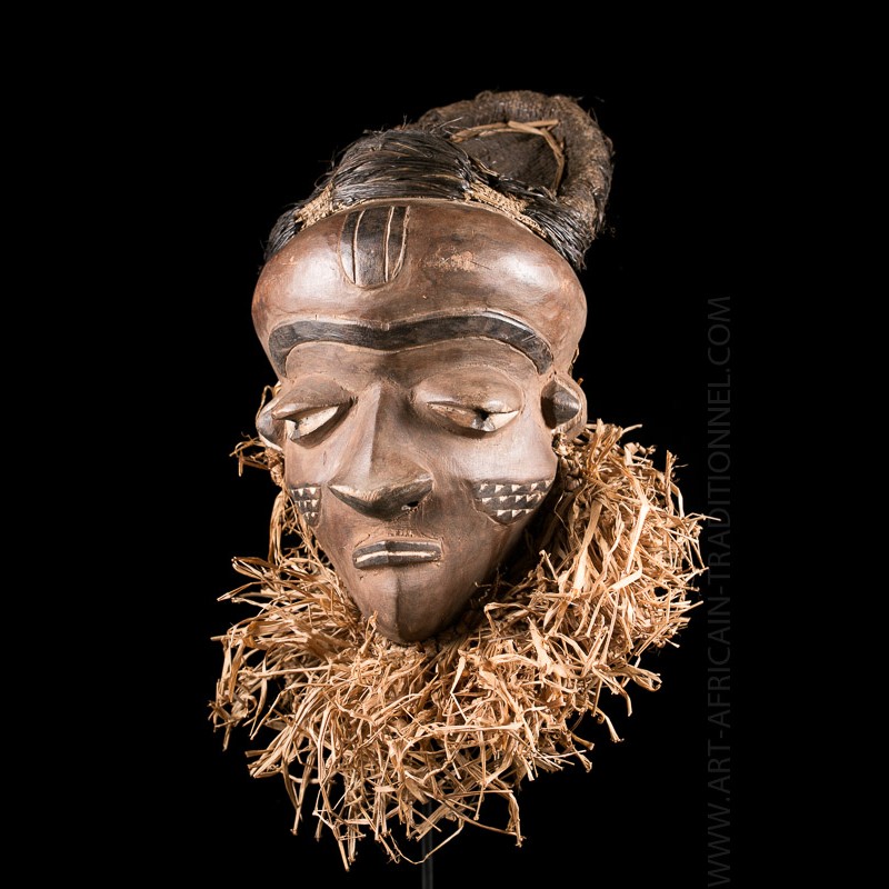 La coiffe en raphia est encore présente. Objet d'art africain en bel état de conservation. Le nez allongé est légèrement retroussé.