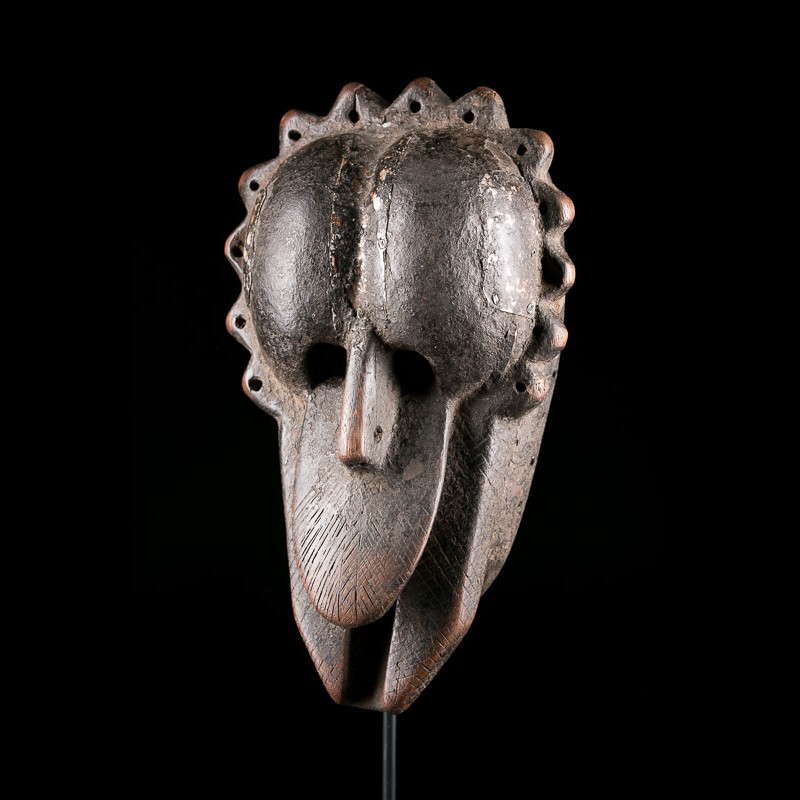 Masque africain Bambara récolté in situ par un médecin français dans les années 1950. Cette typologie est très rare. Il s'agit en tout cas d'une représentation animalière au vu du faciès. Celui-ci est très bien équilibré et comporte de scarifications aussi nombreuses que fines. La patine témoigne d'un important usage. Ce masque possède des yeux béants qui percent le spectateur du regard lors de la danse masquée dans le cadre des rites liés à la chasse.