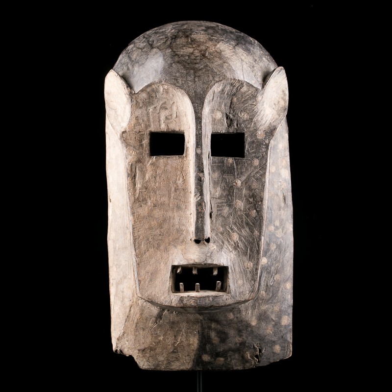 Ce masque africain sculpté dans un bois dense, présente des formes géométriques typiques du peuple Kumu. Le masque a un front arrondi et les sourcils sont hauts et arqués. Les trous pour les yeux sont petits et carrés et le nez est long et droit. La bouche est également de forme carrée et comporte de petites dents finement taillées en bois. Le côté gauche du masque est peint en pigment noir avec une série de points de pigment plus clair sur la surface.