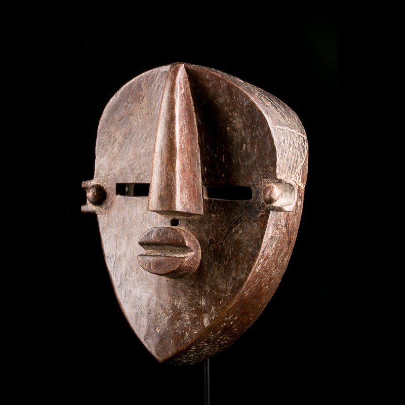 Aisément identifiable par sa forme si caractéristique, je vous propose ici un masque Lwalwa mvondo ou mfondo provenant de la frontière entre la R. D. Congo et l'Angola. Le visage est extrêmement stylisé et abstrait comme sur tous les masques Lwalwa. Le nez est protubérant, tout comme la petite bouche. La face plane est à angle droit d'un pourtour dont le haut est décoré d'une coiffe finement sculpté.