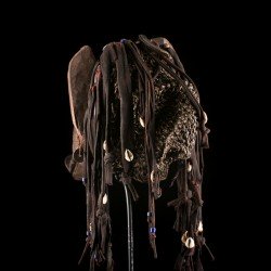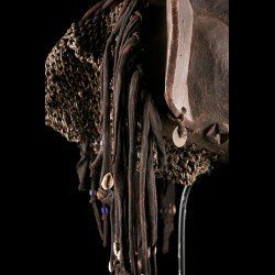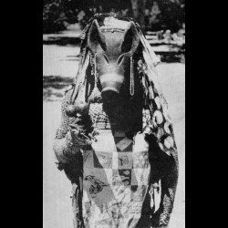 En photo jointe, une photo propriété du Musée de Dundo montrant un porteur du masque Mwana Ngulu ayant sans doute inspiré celui que nous proposons, avec son costume traditionnel.