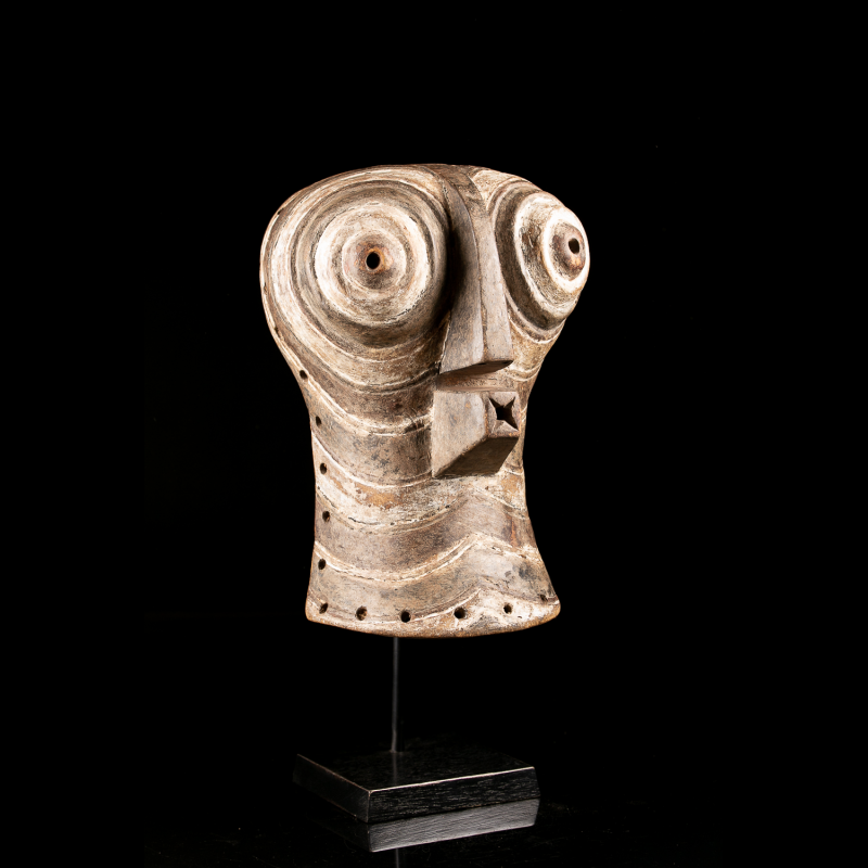 Les exemplaires tels que celui-ci, ornithomorphes, portent le nom ethnique "kitungu" et sont caractérisés par leur face représentant un hiboux aux yeux globuleux.