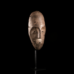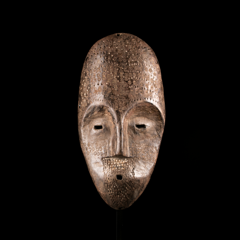 Cette pièce séduit d’emblée par sa présence calme et son graphisme d’une grande finesse. Le visage, allongé et sobre, est rythmé par un modelé très doux : paupières mi-closes, arête nasale rectiligne, bouche discrète. L’ensemble est ensuite “vibré” par une ponctuation serrée de petites cupules, comme une peau travaillée au pointillé, qui capte la lumière et donne au masque une profondeur remarquable.