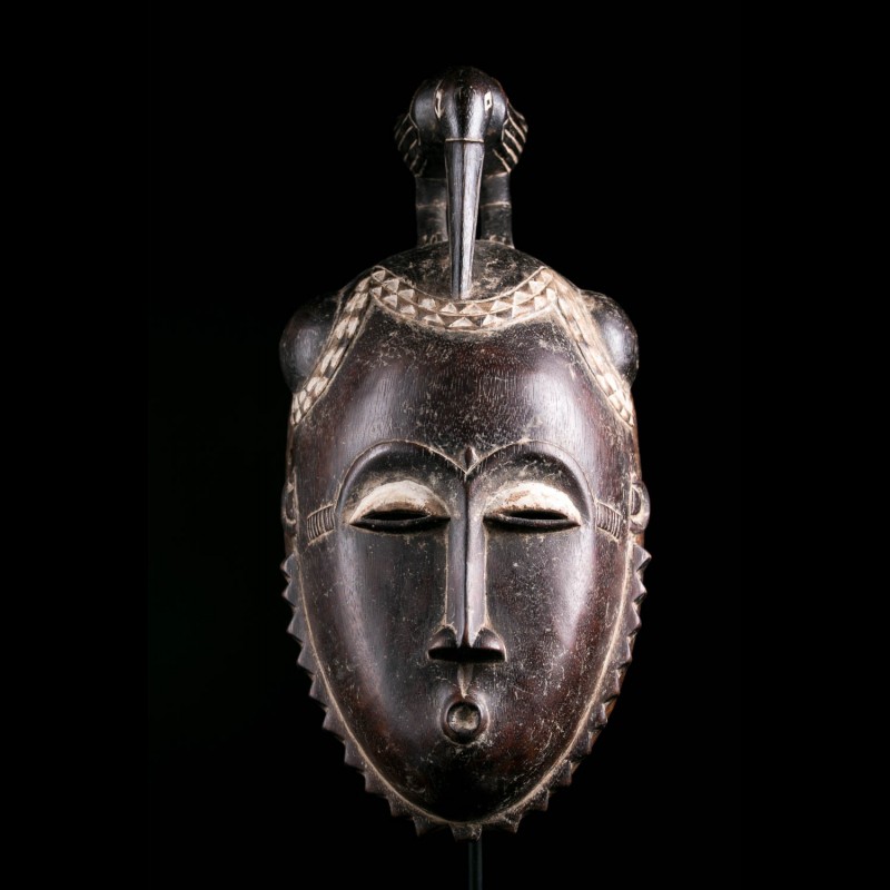 Les pièces Yohouré n'en sont pas moins tout à fait originales et disposent de caractéristiques propres. Parmi celles-ci, on peut noter la présence d'une coiffe frontale dont le bord est finement travaillé et symbolise la richesse. Cette pièce présente également une très belle symétrie. Les arcades sourcilières en arc de cercle se rejoignent et se prolongent sur l'arête du nez. Les masques Yohouré sont aussi célèbres pour leurs ornements cimiers. On retrouve ici une représentation d'oiseau penché en avant.