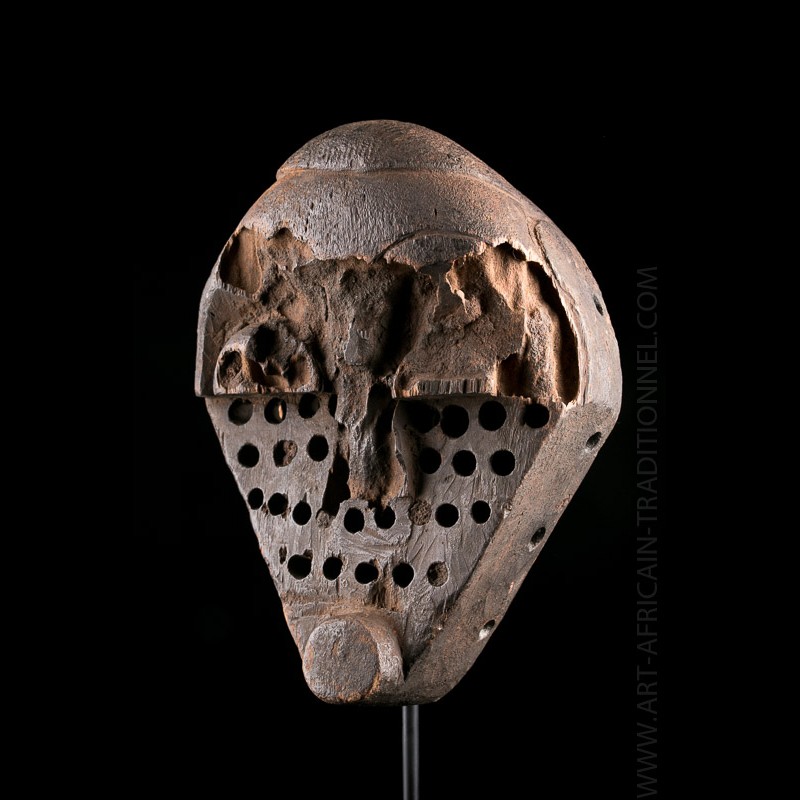 Il s'agit d'un exemplaire du masque classique «Kindombolo-Mapombolo» signifiant "fouteur de merde" ou "trouble maker". Il en existe des variantes à cornes mais plus récentes et moins prisées. Ce masque est un pièce première génération à l'allure brute.