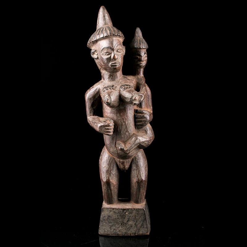 Une figure en bois d'une femme avec une belle patine. La tête est légèrement tournée et a une coiffure en forme de bonnet de cheveux avec une pointe vers le haut. Le visage a de petits yeux allongés, un nez court et des lèvres charnues jusqu'à la bouche. Le corps est trapu avec des seins proéminents, chacun avec une marque de scarification au-dessus. Le bras droit est plié au niveau du coude avec la main posée sur le ventre. Le bras gauche berce un bébé portant une coiffure similaire à celle de la mère.