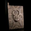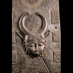 Porte de grenier à grain Baoulé ou Yohouré ornée d'un important masque à cornes. Les objets usuels et le mobiliers ont toujours constitué des supports de choix pour les sculpteurs dans l'art africain. Cet objet ne déroge pas à la règle.