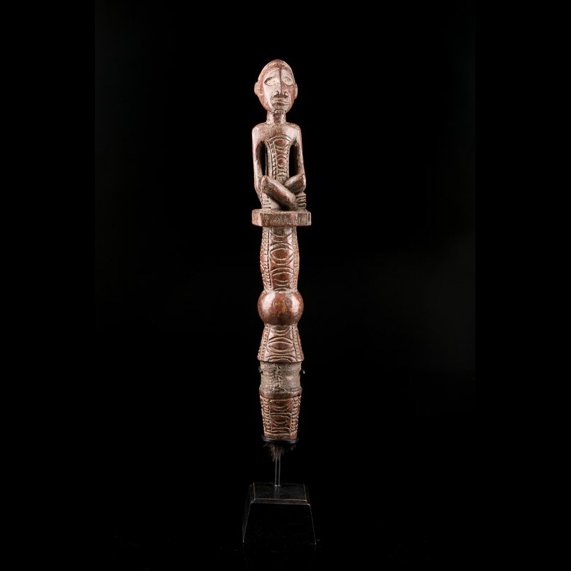Chez les Bembe, les arts plastiques font la part belle aux ancêtres, aux esprits et aux forces de la nature. L'art sculptural Bembe, contrairement à ce qui s'observe chez d'autres populations d'Afrique noire, pour ce qui concerne les domaines de la religion, de la magie, de la politique, thérapie, etc.., se cantonne donc à la figure anthropomorphe sculptée dans le bois, utilisée non seulement dans la confection de supports magique ou religieux, mais également dans la création de certains accessoires tel que ce chasse-mouche présenté dans une position assise, jambes croisées et aux marques corporelles sous formes de tatouages à l'aspect chéloïdien. Sculpture maitrisée, vendue sur son socle personnalisé.