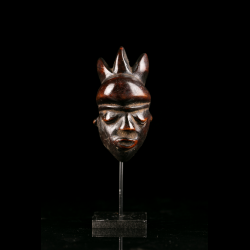La coiffure sommitale tripartite, les proportions ramassées du visage et la tension des lignes confèrent à cette pièce une présence remarquable malgré ses dimensions modestes. Ce type de réduction sculpturale, loin d’être anecdotique, exigeait au contraire une véritable maîtrise technique afin de condenser en quelques centimètres toute la puissance visuelle d’un grand masque cérémoniel.