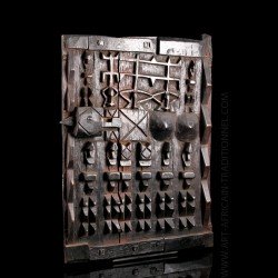 Comme les piliers, les volets et les échelles, dans l'art africain, les Dogon ont aussi produit des portes de greniers à grain ou de case. On y trouve le plus souvent des représentations cosmogoniques telles que des Nommo (personnages primordiaux), des danseurs Kanaga ou Sirigé, des animaux totémiques tels que les lézards, les crocodiles, les serpents.