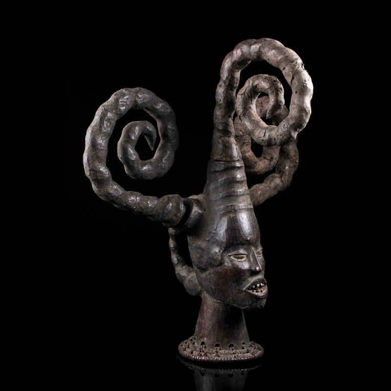 Ce masque cimier africain traditionnel du Cameroun représente ici un personnage janiforme porte une coiffure monumentale composée de trois grands appendices enroulés d'une ampleur inattendue dans la statuaire africaine, et qui témoignent d'une réelle prouesse technique dans la perfection et la symétrie des enroulements. Des récits ethnographiques rapportent que cette coiffure était portée par les jeunes filles pendant l'initiation et la période de réclusion précédant le mariage.