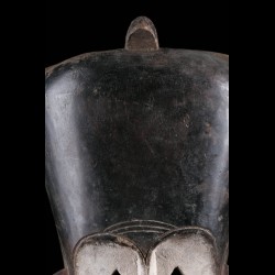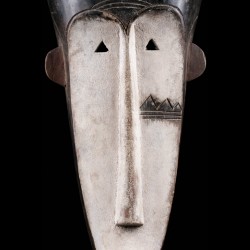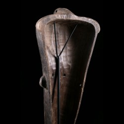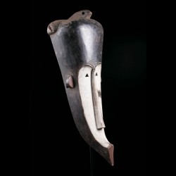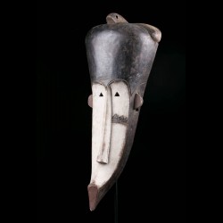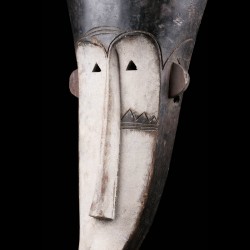Chez les Fang en Afrique, comme dans toute société structurée, il convenait de faire régner l'ordre par l'intermédiaire des masques. Dans la société du Ngil, le grand initié (Ngang) aidé par ses officiants, parcourait les villages dissimulé sous un masque tel que celui-ci, allongé et couvert d'une épaisse de couche de kaolin.