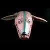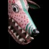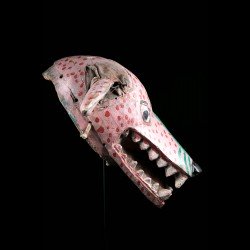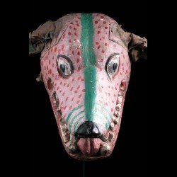 Ce masque tribal coloré est caractéristique du culte Gelede. Il représente ici une hyène mais on en trouve représentant des visages humains, portant parfois un plateau sur lequel des scènes sont représentées. Il faut noter que ce masque, les oreilles sont articulées à l'aide d'une corde.Les mascarades Gelede ont donc pour but de restaurer cette harmonie sociale en «amadouant» la partie féminine de la société. Elles sont précédées de grandes cérémonies de nuit, les Efe, au cours desquelles la parole est libre et qui sont, de nos jours, des fêtes où se jouent comédies et satires.