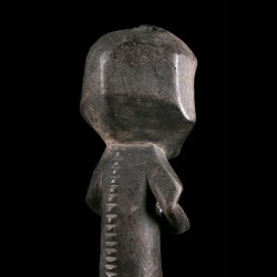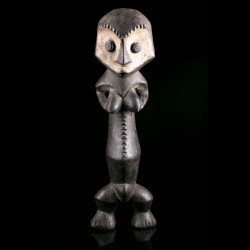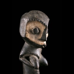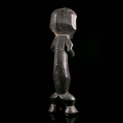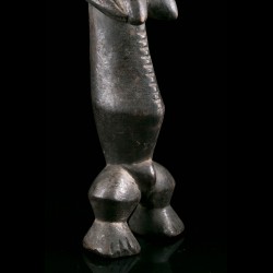 Cette figurine africaine présente une face à deux facettes légèrement concaves incrustées de kaolin comme pour en faire ressortir le contraste. Le long tronc repose sur de petites jambes solides. Les bras sont repliés sur le torse.