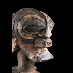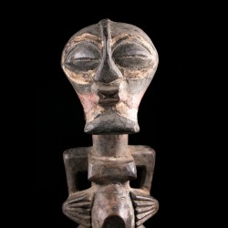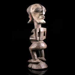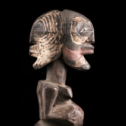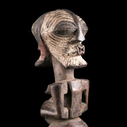 Sur cette statue traditionnelle, on retrouve une particularité : la présence de deux visages opposés, faisant de cette figure une pièce janiforme assez rare. Les têtes sont par ailleurs des représentations miniaturisées des masques liés au culte du Kifwebe chez les Songye. Ces masques striés au style cubiste sont liés des rituels judiciaires principalement.