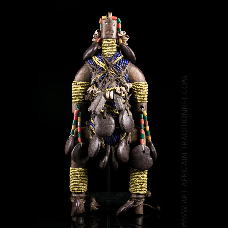 Les Namji aussi appelés Namchi sont connus pour ces poupées perlées à l'allure géométrique. Celle-ci possède des yeux incrusté d'une perle, lui donnant un regard surprenant. Ces poupées pouvaient être portées à la ceinture afin d'augmenter les chances de conception des femmes. Belle patine ancienne. Réparation indigène légèrement visible la jambe gauche.
