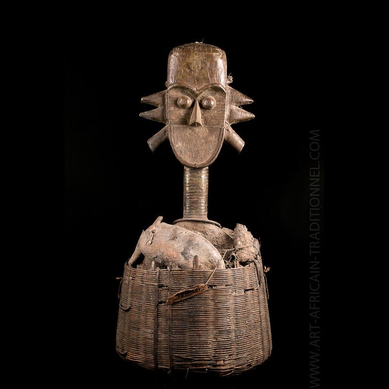 Le reliquaire africain que nous vous proposons a un style très marqué avec un visage expressif et surmonte encore un imposant panier rempli d'ossement et d'accessoires divers. Ses formes permettent de l'attribuer à la région de Sangu, à l'Ouest du territoire Kota, au centre du Gabon.