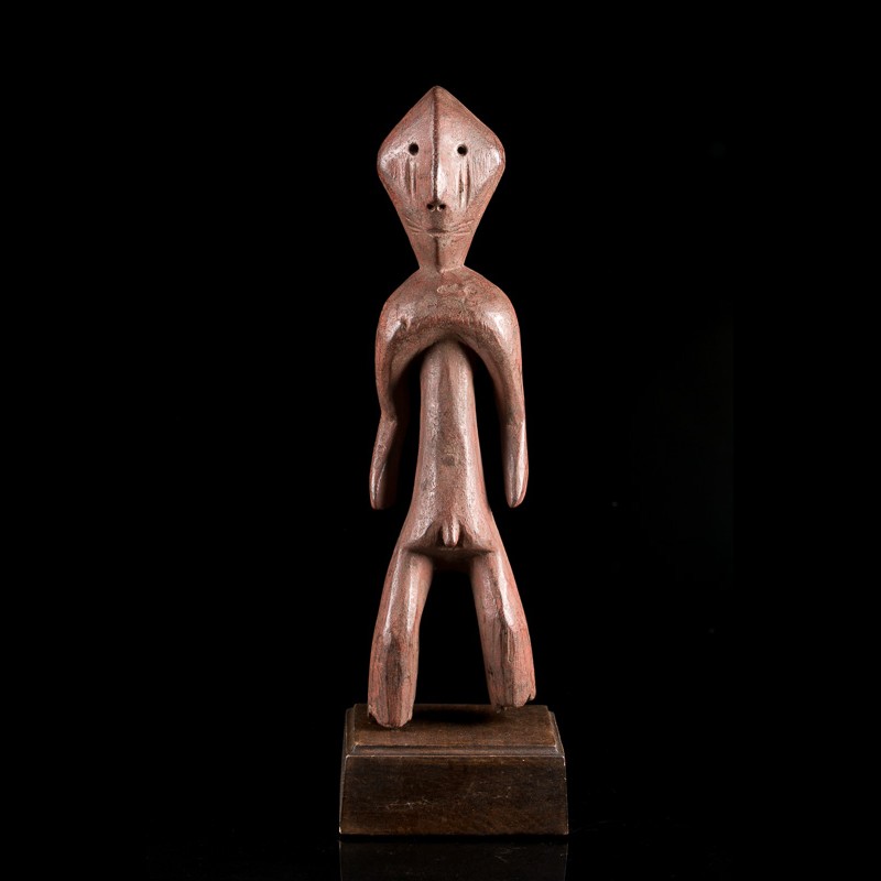 Statue africaine en bois représentant un homme dont toute la surface est recouverte d'ocre rouge. La tête est presque en forme de diamant avec le nez et les oreilles formant des points. Le visage a de petits trous percés pour les yeux, un long nez presque crochu avec une série d'encoches vers le haut, une petite bouche et des marques de scarification sur le côté et les joues. Le corps se distingue par la poitrine et les épaules larges, les bras suspendus sur le côté. Le corps s'élargit jusqu'aux hanches et il y a un petit pénis. Les jambes sont pliées au niveau des genoux et présentent une musculature robuste.