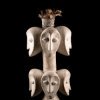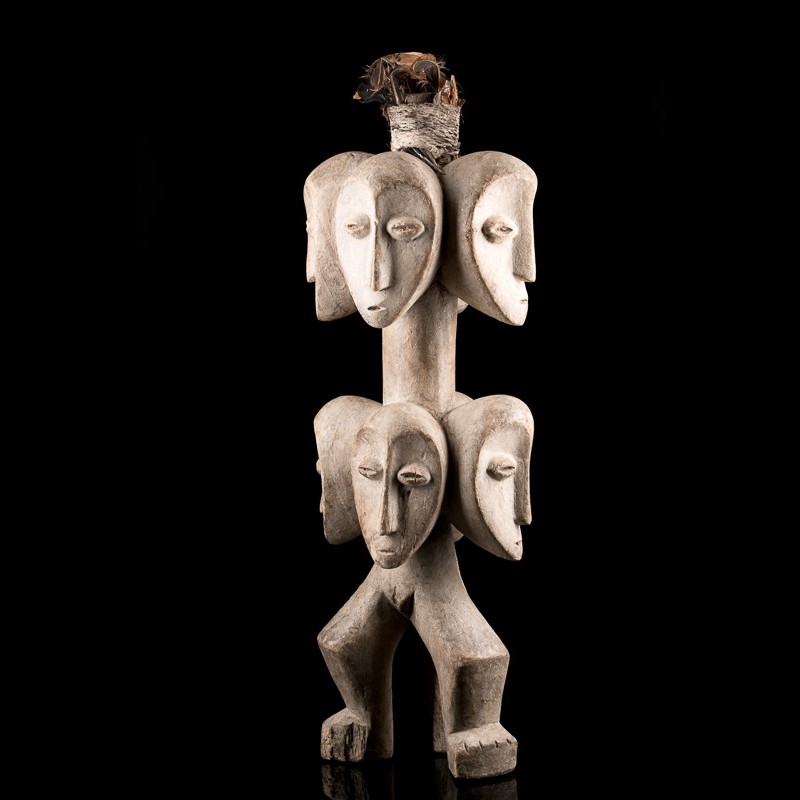 Impressionnante statue surréaliste comportant de multiples petits visages dirigés dans toutes les directions semblant fixées sur un tronc reposant sur de petites jambes. Ces visages sont très semblables aux masques traditionnels primitifs Lukwakongo chez les Lega. L'ensemble est couvert de kaolin et surmonté d'une petites coiffe en plumes.