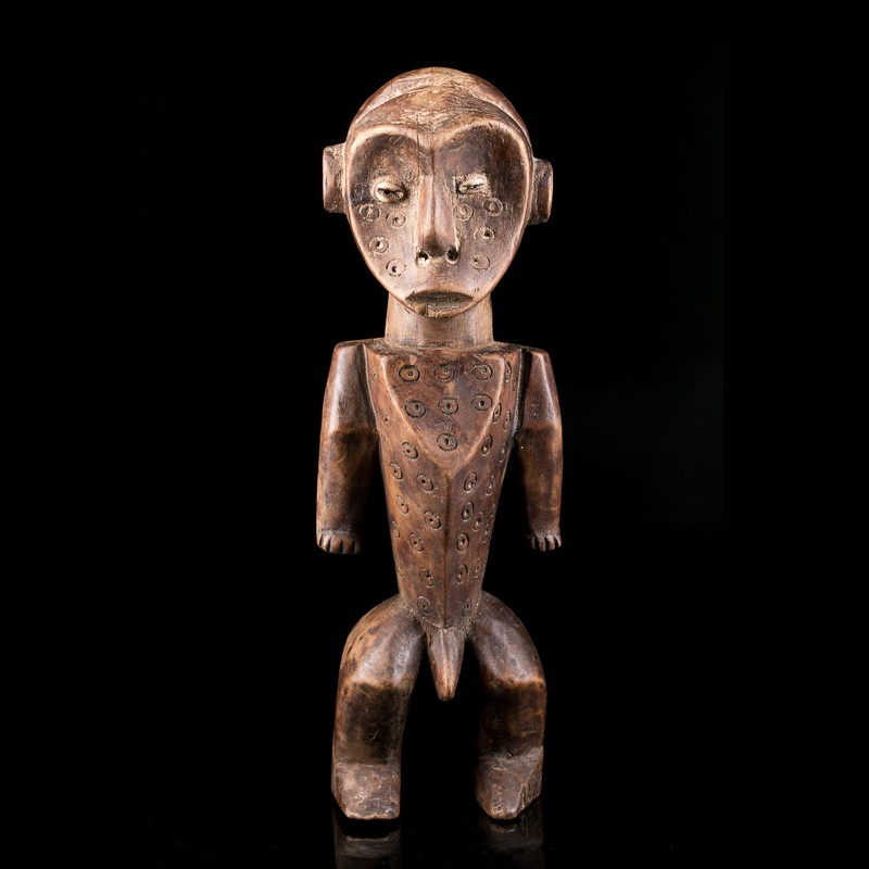 Cette statue en bois monoxyle Lega de caractère fait partie d'une catégorie à la fois extrêmement importante et limitée d'œuvres d'art Lega. Elle fait partie des objets sacrés de la propriété collective liés aux rites Kindi. Contrairement aux figurines d'ivoire et d'os, une action dramatique intense est associée à la révélation et à l'interprétation de ces figurines. Ses yeux sont incrustés de cauris.