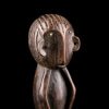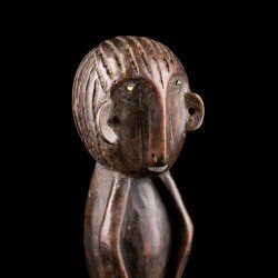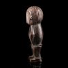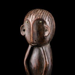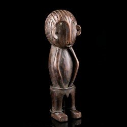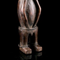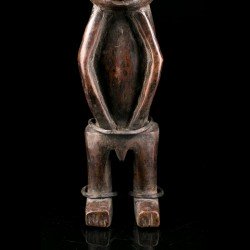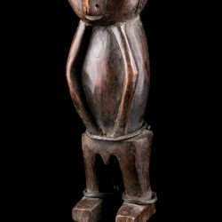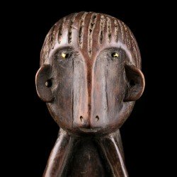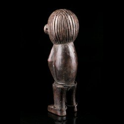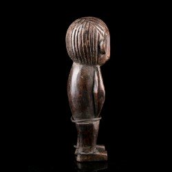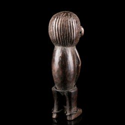 Statuette africaine masculine en bois. Le personnage est doté d'une tête imposante reposant sur un corps cylindrique dénué de cou, dont les bras font partie intégrante, légèrement fléchis. De petites jambes droites aux pieds détaillés supportent le tout. On notera la présence d'anneaux métalliques à la taille et aux chevilles. Les yeux sont incrustés de perles.