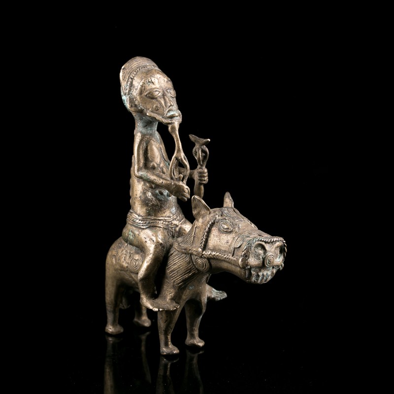 Superbe sculpture d'art africain Baoulé de l'Afrique de l'ouest. Visiblement un haut dignitaire Baoulé sur sa monture très fine en laiton ou en alliage bronzier.