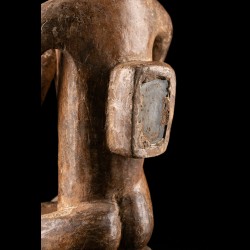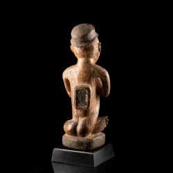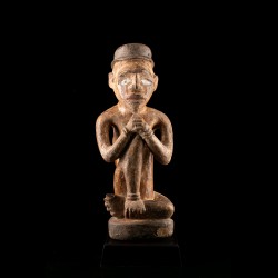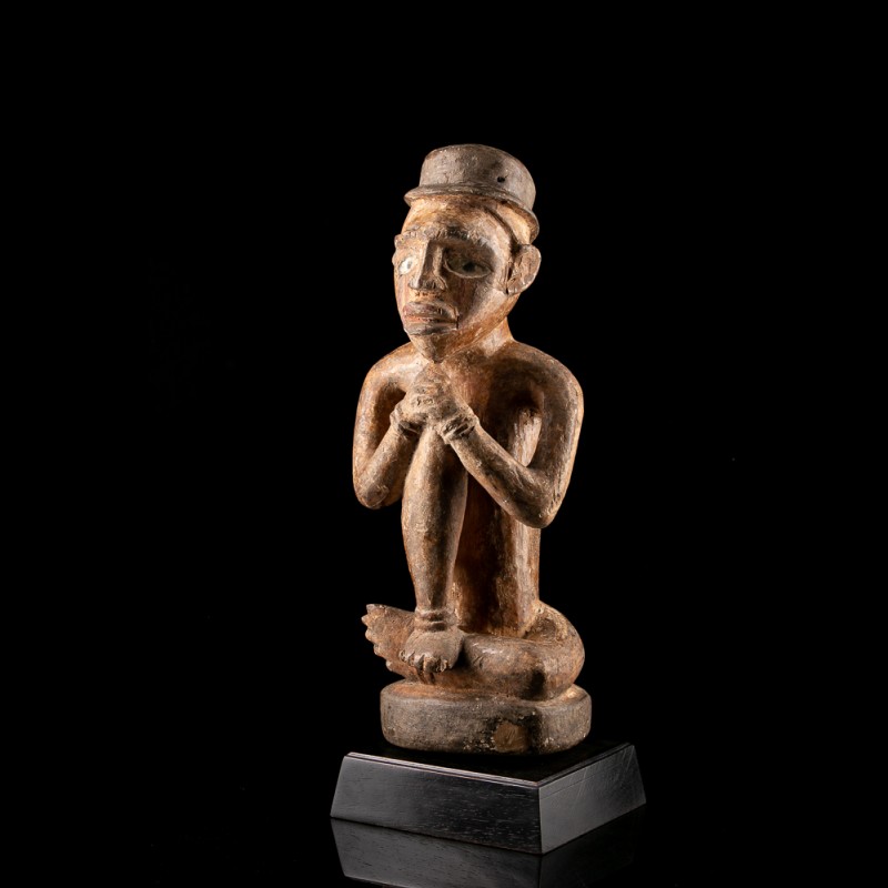 Cette statue est une pièce majeure d'art bakongo. Le personnage est représenté assis, les jambes à angle droit, main jointes sous le menton. Les yeux sont incrustés de verre insufflant la vie au personnage. Sur sa tête, un couvre-chef de style colonial. La patine est claire. Dans le dos, une surprenante cavité encore scellée destinée à contenir la charge magique. Le miroir l'obturant devait permettre au devin de déceler l'approche des sorciers et s'en prémunir.