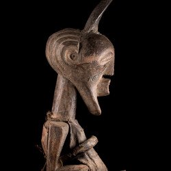 Sur corps, un besace ventrale et un pagne. Le nombril et le crâne sont encore flanqués d'une corne remplie d'une charge magique. Le traitement de la bouche mérite d'être mentionné : puissante et extrudée, la bouche est ouverte, montrant ses dents. Cela symbolise toute la puissance de la parole dans le rôle de protection contre les maléfices.