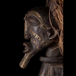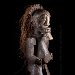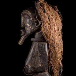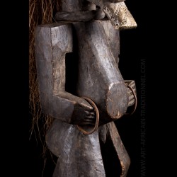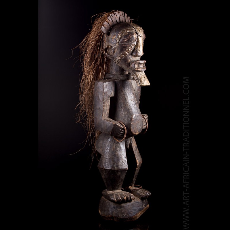 Cette superbe pièce monoxyle visiblement ancienne se tient debout sur une base circulaire, les bras anguleux fléchis. Une épaisse coiffe de raphia est encore présente.