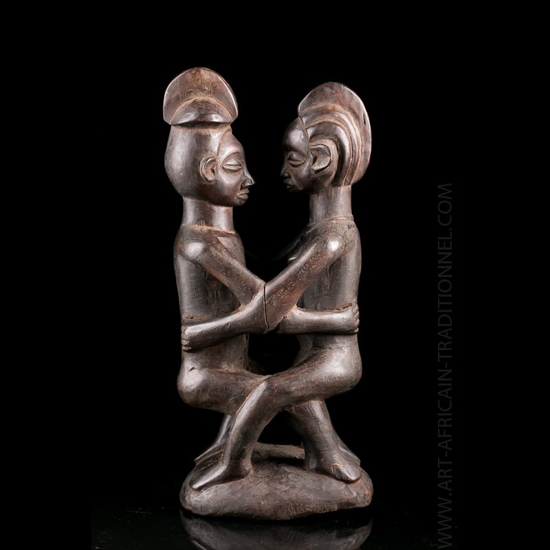 Dans le sud, le long de la rive occidentale de la Lubilash, les Kanyok (Kanioka) ont gardé dans leur sculpture de la folie ainsi que quelques objets de regalia, cette sculpture en est la preuve. Cette statue provient et fut récoltée dans un atelier Kanyok, aux environs de Kanda-Kanda, elle présente sur chaque personnage une coiffure caractérisée par des chignons relevé sur le dessus et de formes sphériques. Cette coiffure s'est plus largement répandue sur la rive orientale de la Lubilash chez les Kalundwe. Ce sont des information très précieuses et qui fait de cette statuette un authentique petit objet d'art tribal africain.