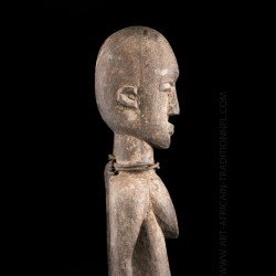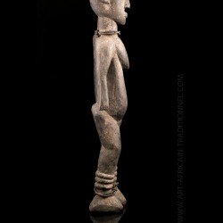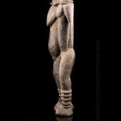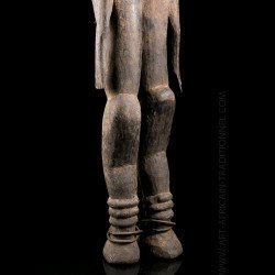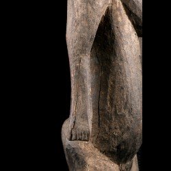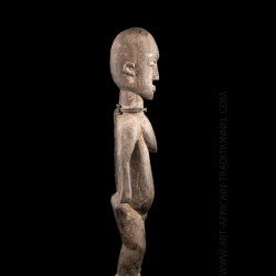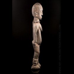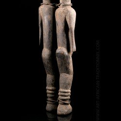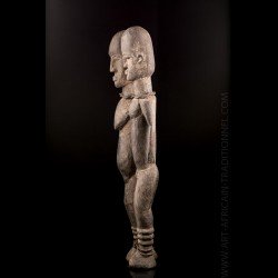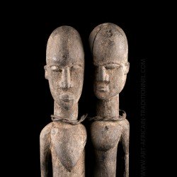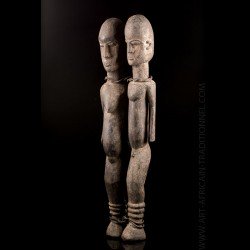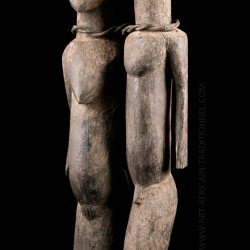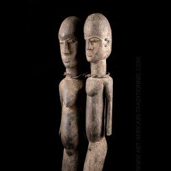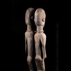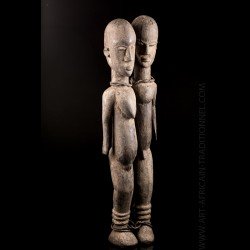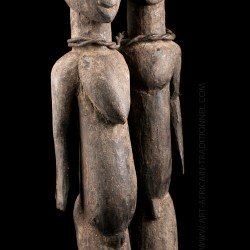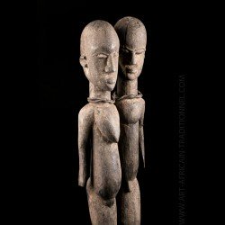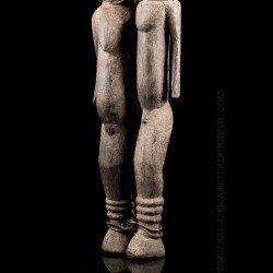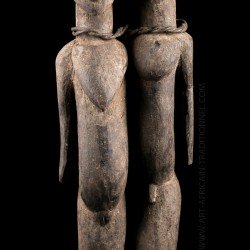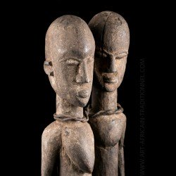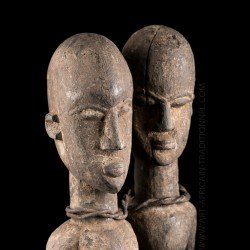 Statue Lobi Bateba de style Thil Dokpa. Scène aux corps soudés caractéristiques qui donne lieu à de la grâce et de la tendresse, affirmant ainsi la richesse stylistique des sculpteurs Lobi et leur habileté. La ligne des corps qui tantôt fusion - nent et tantôt se disjoignent, s’achève toujours par des visages pensifs, soudainement arrété dans leur vie quotidienne par la magie du ciseau.