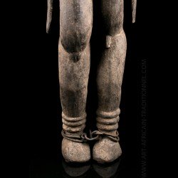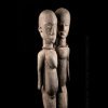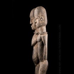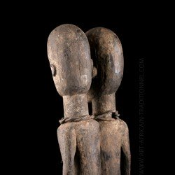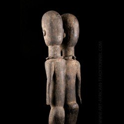 Cette ambivalence entre le support et la représentation est encore accentuée dans cette statue à double corps et visage : janus traditionnel. Le dédoublement traduit ce désir de l’artiste de dépasser le pouvoir de l’humain pour passer de l’autre côté du miroir, dans le domaine de l’invisibilité, source de puissance et d’extraordinaire. La relation des Lobi à leur divinité est bienveillante aux yeux du sculpteur, même dans la représentation de leurs figures les plus improbables. Les Bateba sont, pour leurs propriétaires, protection et non menace. Que son style soit rudimentaire ou sophistiqué, géométrique ou naturaliste, l’âme Lobi reste en harmonie avec son destin.