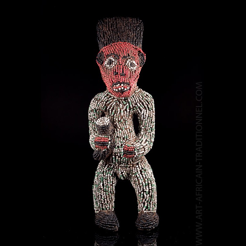 Dans l'art africain du Cameroun, comme pour leurs masques, les groupes de l'empire Bamileke conçoivent des statues expressives, ici à l'aide perles.