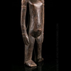 statue africaine figurant un ancêtre Senoufo. On reconnait la coiffe haute et la bouche prognathe. Le corps est élancé, le cou arqué. Le personnage est empreint d'un air serein. Dans l'art africain Senoufo, ce type de figurine servait à rendre un culte aux ancêtres et était conservé dans la case familiale.