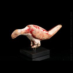 Il est présenté ici en sculpture sur bois datée du milieu du XXe siècle, son plumage est suggéré par un piqueté ou un liseré de couleur rouge.