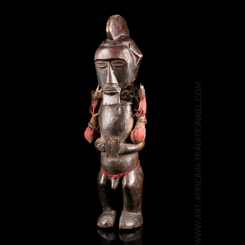 Les statues et figurines sculptées par les artistes Teke se caractérisent par des jambes légèrement pliées, un torse encadré par des bras pliés à angle droit et une tête élargie avec des scarifications faciales linéaires typiques et une barbe trapézoïdale. Ces éléments sont bien présents ici comme on peut le voir.
