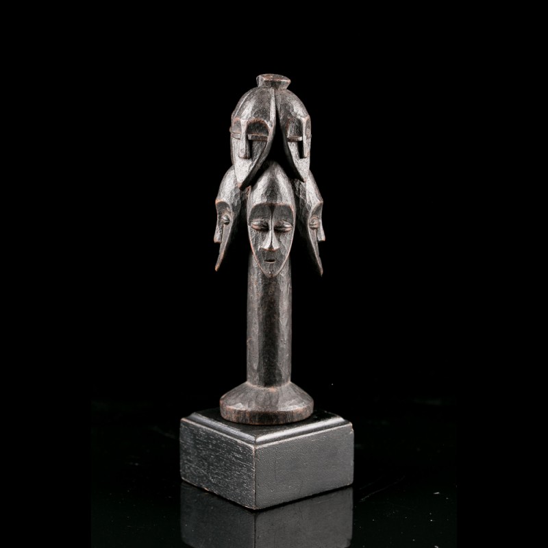 Cette statuette africaine Lega se composé d'un pied évasé au fond, surmonté d'un agrégat de visage orientés dans toutes les directions. L'aspect remarquable de cette pièce atypique réside dans la répartition des visages sur deux étages superposés.